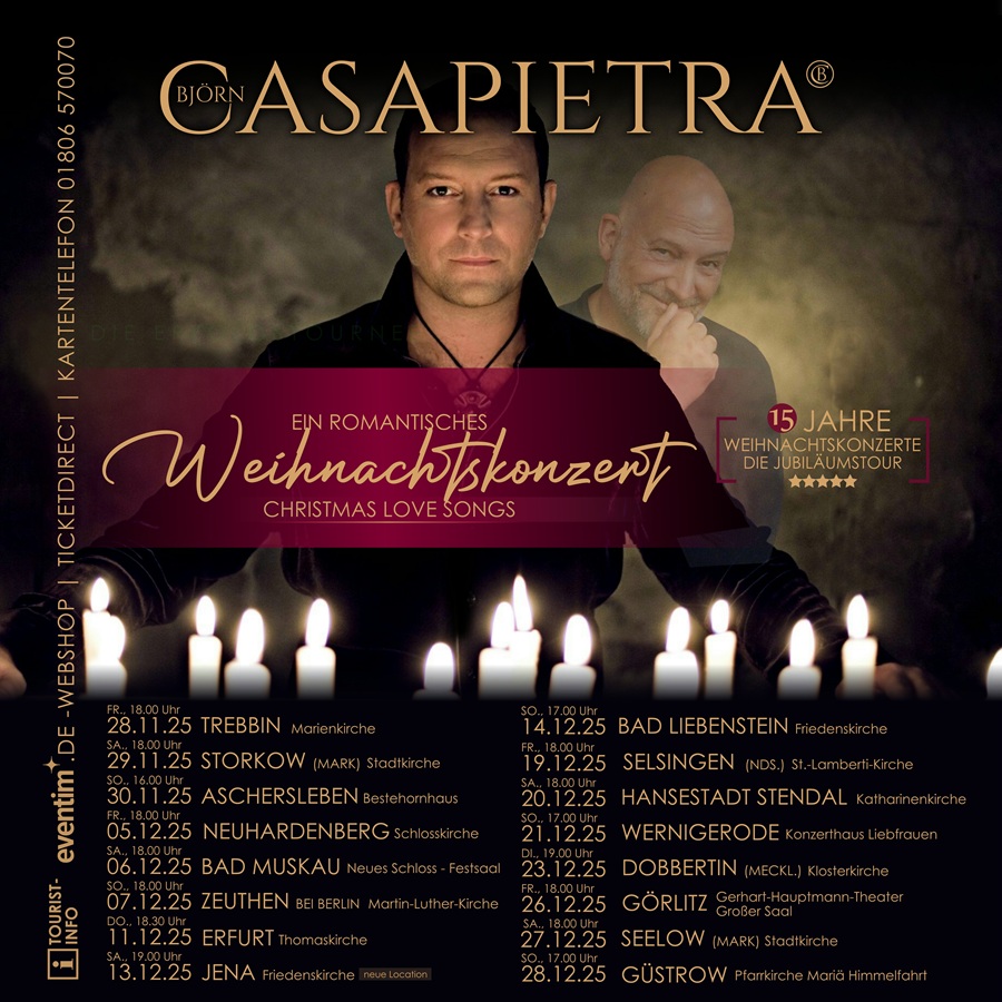Björn Casapietra – Christmas Love Songs. Ein romantisches Weihnachtskonzert: am 11.12.2025 um 18.30 Uhr in der Thomaskirche Erfurt. Tickets sowie weitere Informationen sind zu finden unter www.casapietra.de!