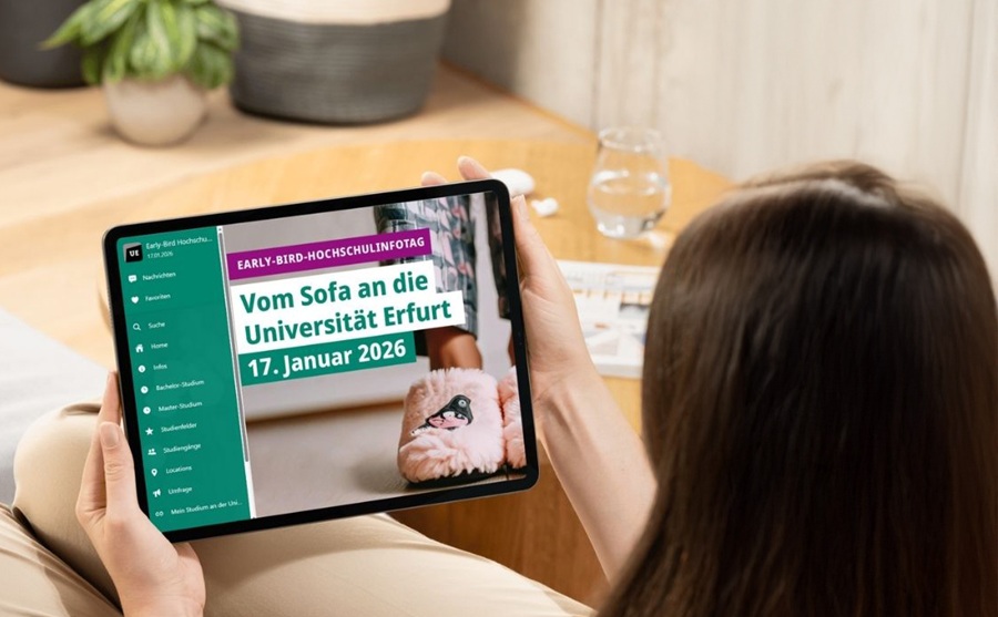 Für alle, die mit guten Vorsätzen ins neue Jahr starten und sich möglichst frühzeitig für ein Studium entscheiden möchten, bietet die Universität Erfurt am Samstag, 17. Januar 2026, in der Zeit von 10 bis 13 Uhr erstmals einen Early-Bird-Hochschulinfotag an. Alles digital – so geht das Ganze auch bequem vom Sofa aus.